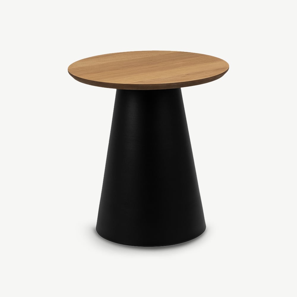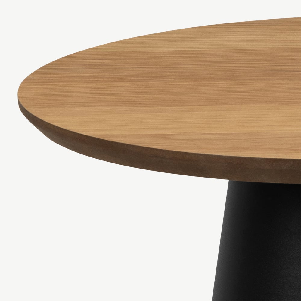 Het tafelblad van FSC-gecertificeerd eikenfineer zorgt voor een warme, natuurlijke uitstraling, terwijl de matzwarte conische poot zorgt voor stabiliteit en een moderne look. Deze tafel past prachtig in Scandinavische, industriële of minimalistische interieurs. Combineer met zachte stoffen, aardetinten of leren accenten voor een gebalanceerde en uitnodigende sfeer.