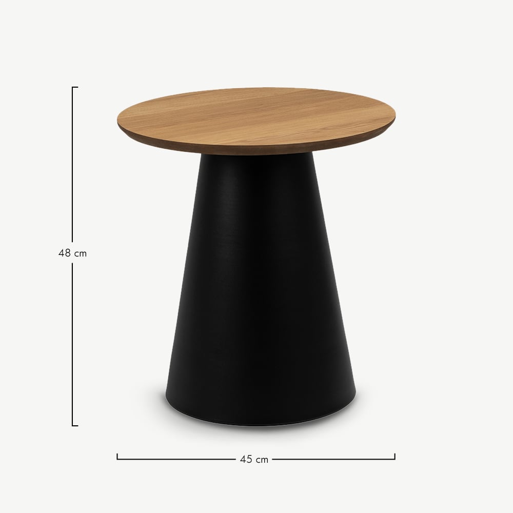 De Ella bijzettafel Ø45 cm is een compact en stijlvol accent voor elk modern interieur. Met een FSC-gecertificeerd eikenfineer blad en een stoere zwarte metalen conische voet combineert hij natuurlijke warmte met een strak, sculpturaal ontwerp. Dankzij het formaat van Ø45 cm en de hoogte van 48 cm past hij perfect naast een bank of fauteuil, en laat hij zich goed combineren met de andere Ella tafels voor een gelaagd geheel.