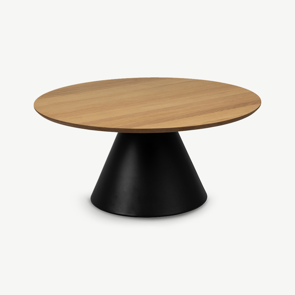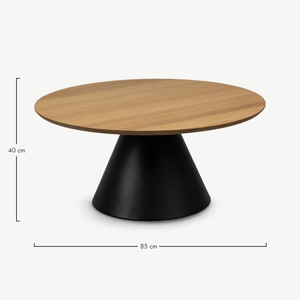 De Ella salontafel Ø85 cm is een krachtig maar verfijnd middelpunt dat natuurlijke warmte en sculpturaal design naar je woonkamer brengt. De tafel heeft een FSC-gecertificeerd eikenfineer blad en een stevige conische metalen poot in matzwart – goed voor een ruime oppervlakte en een tijdloze uitstraling. Met een hoogte van 40 cm is hij perfect als losse blikvanger of gecombineerd met de kleinere Ella tafels voor een gelaagd effect.