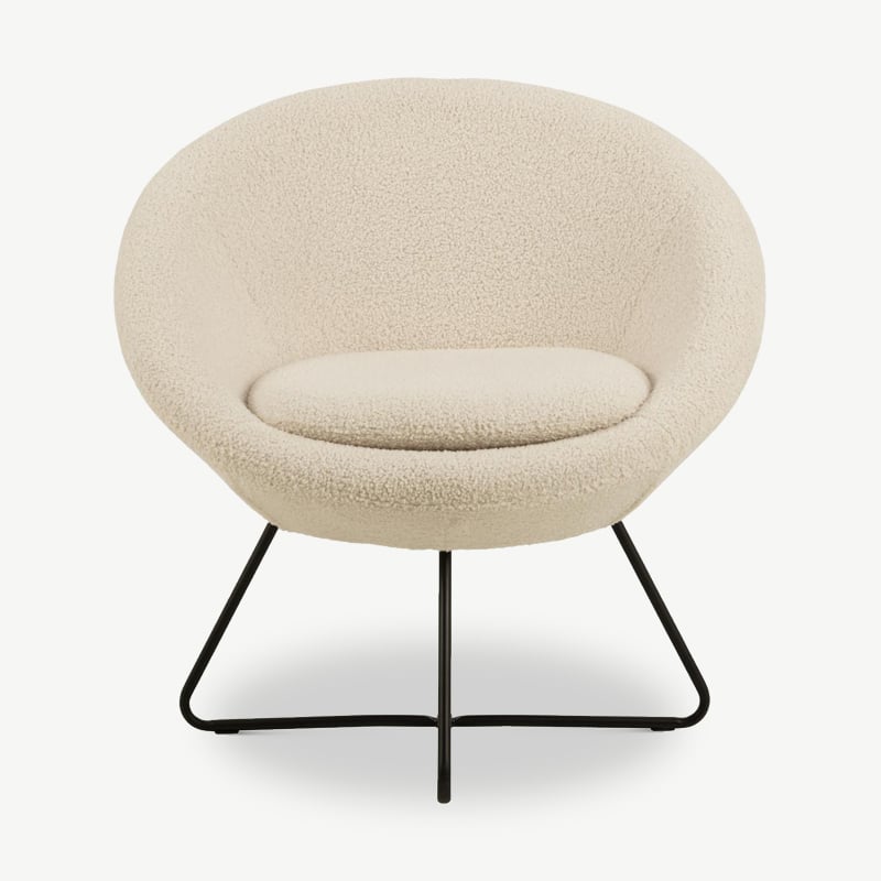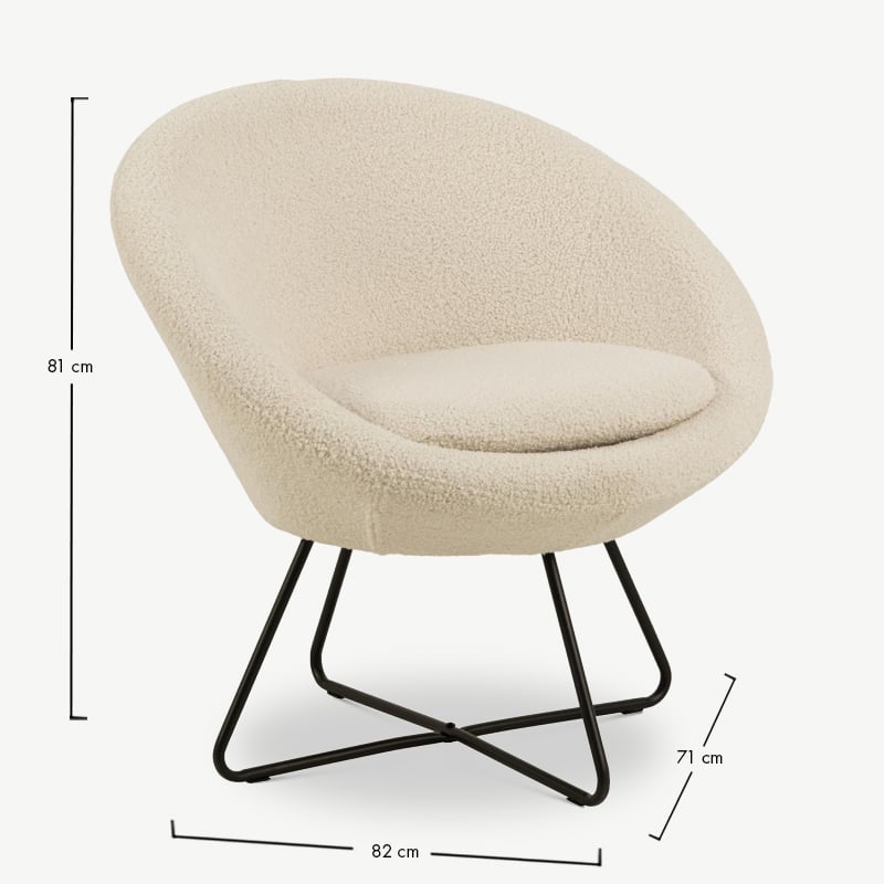 De combinatie van zachte bouclé stof en ronde vormen creëert een rustige, gezellige sfeer. Perfect als leesstoel, extra zitplek in de woonkamer of stijlvol accent in de slaapkamer.