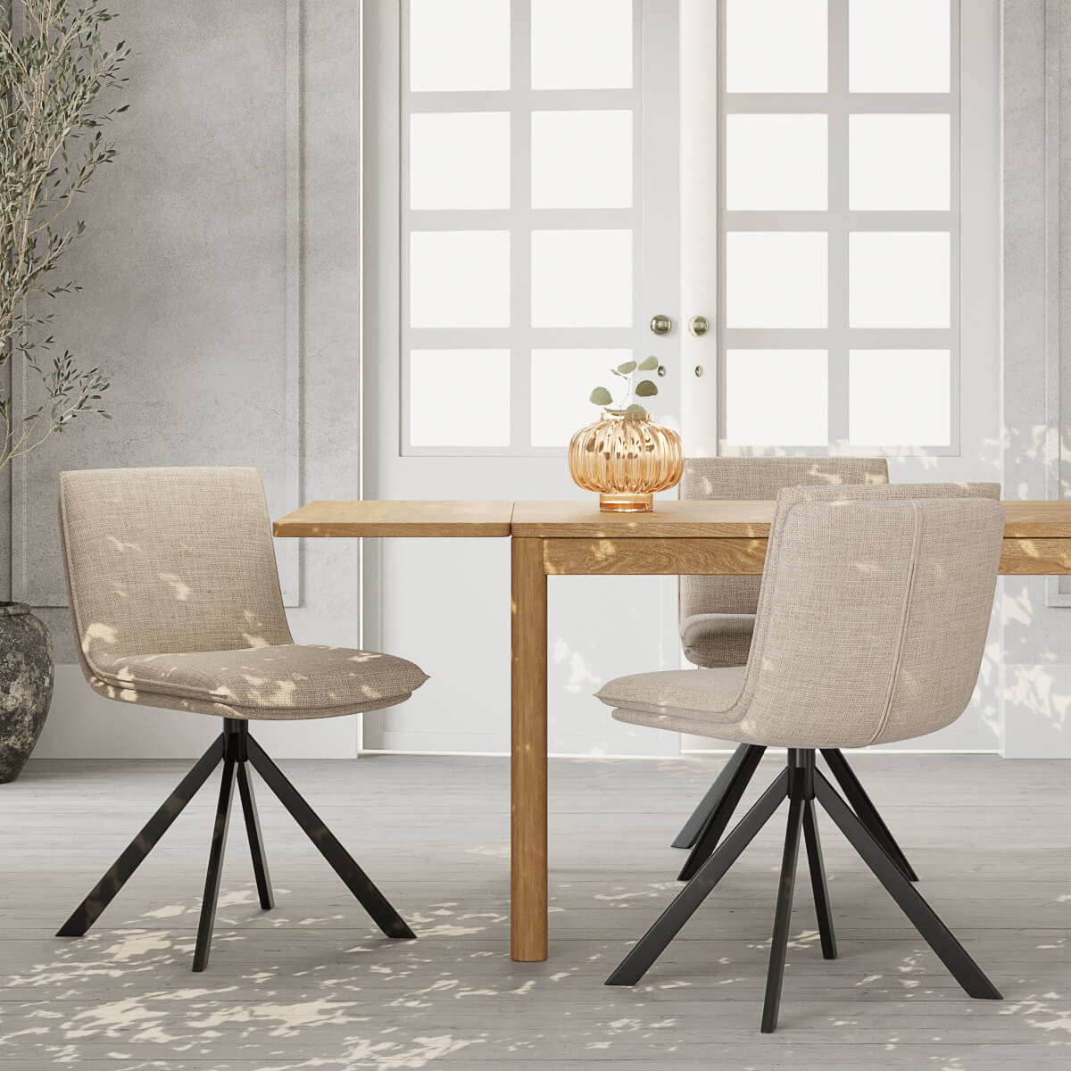 Deze eetkamerstoel is uitgerust met een prachtige beige stof die elke eetkamer verfijning en elegantie geeft. De stof is zacht aanvoelend en duurzaam, waardoor de stoel er jarenlang mooi uit blijft zien. De stevige 4-sterren basis is voorzien van een matte zwarte poedercoating, wat een moderne afwerking creëert die perfect past bij de beige stof. Zo ontstaat er een strakke en stijlvolle uitstraling die zeker indruk zal maken op uw gasten.