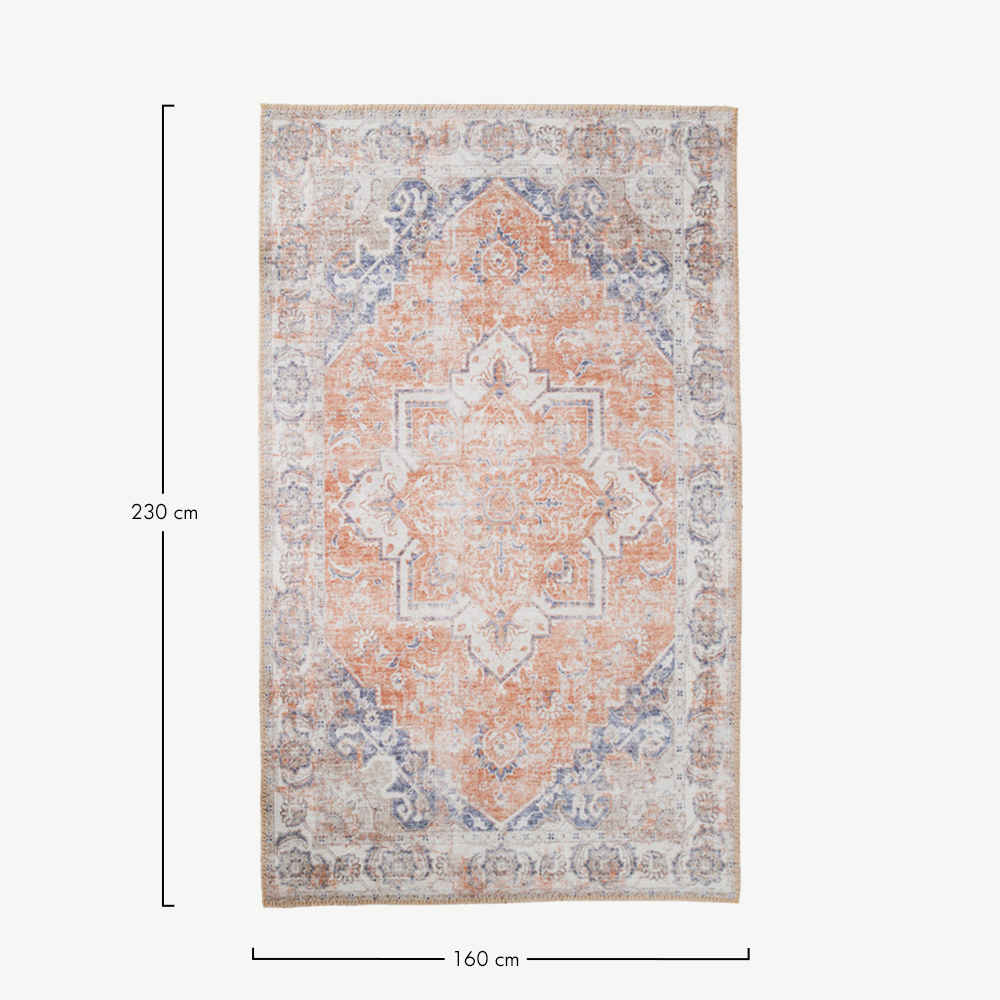 Dit tapijt voegt een verfijnde, uitnodigende sfeer toe aan elke kamer. Het kleurenpalet van oranje en blauw past bij diverse interieurstijlen, van klassieke kamers tot moderne, eclectische ruimtes. Het gedetailleerde ontwerp is een opvallend middelpunt dat de uitstraling van je huis moeiteloos verbetert.