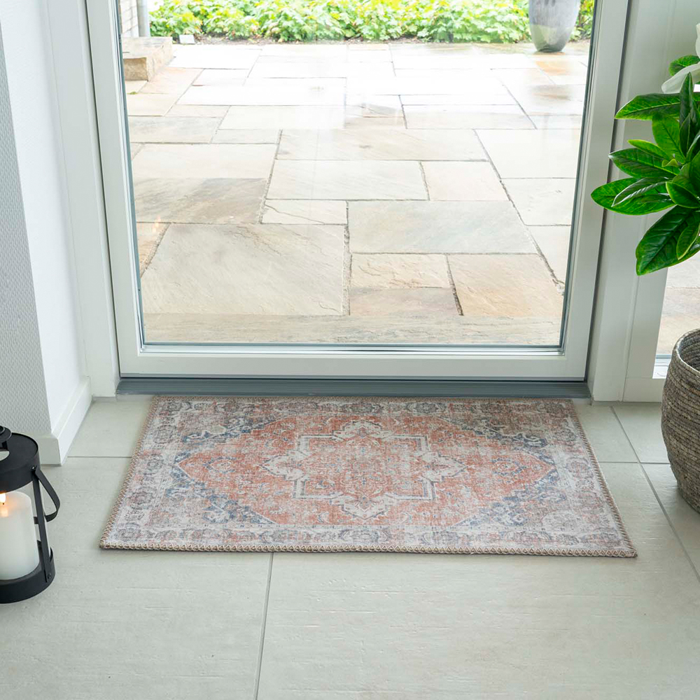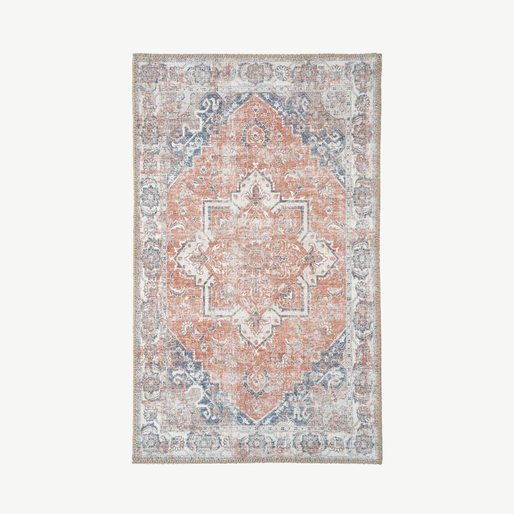 Dit tapijt voegt een verfijnde, uitnodigende sfeer toe aan elke kamer. Het kleurenpalet van oranje en blauw past bij diverse interieurstijlen, van klassieke kamers tot moderne, eclectische ruimtes. Het gedetailleerde ontwerp is een opvallend middelpunt dat de uitstraling van je huis moeiteloos verbetert.