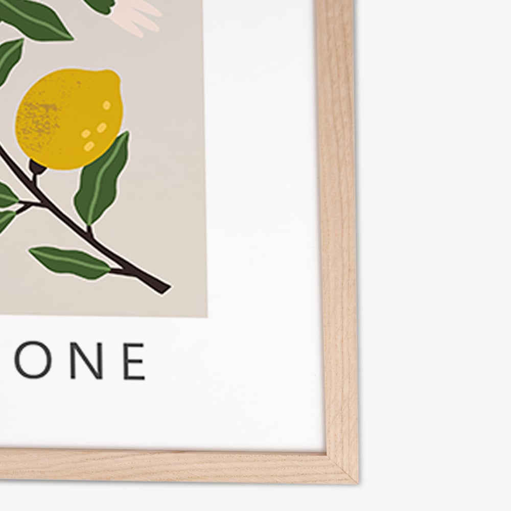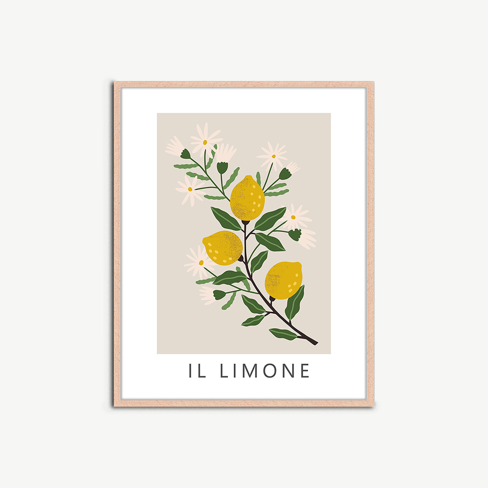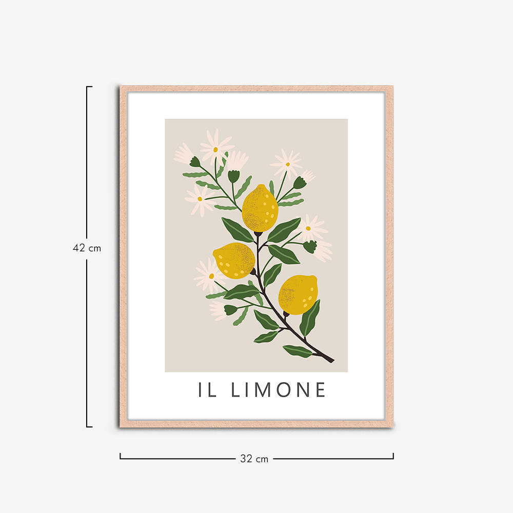 De Il Limone poster wordt geleverd in een natuurlijke lijst, bekend om zijn duurzaamheid en natuurlijke schoonheid. Het houten frame omlijst de poster op een manier die diepte en dimensie toevoegt, waardoor het een echt middelpunt van je interieur wordt.