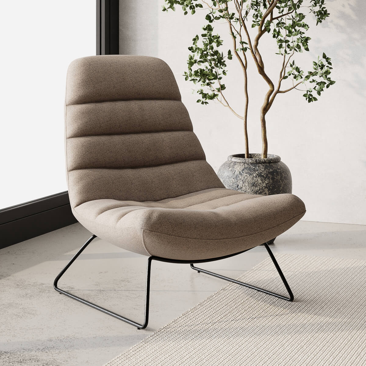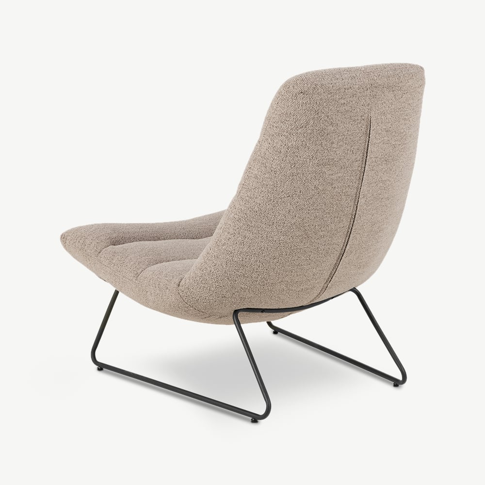 Bekleed met luxueus, beige bouclé, straalt de Kelly Lounge Chair warmte en textuur uit, wat hem een uitnodigende toevoeging maakt aan elke ruimte. De stevige zwarte metalen poten zorgen voor een modern contrast, terwijl de horizontale stiksels de gestroomlijnde, ontspannen vorm benadrukken. Ideaal in combinatie met neutrale of houten meubels voor een gezellige, verfijnde sfeer.