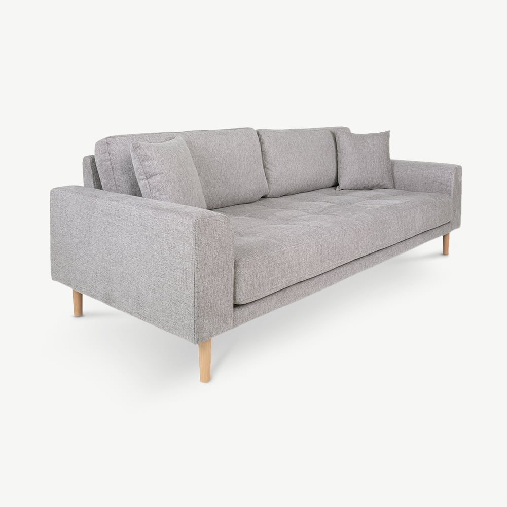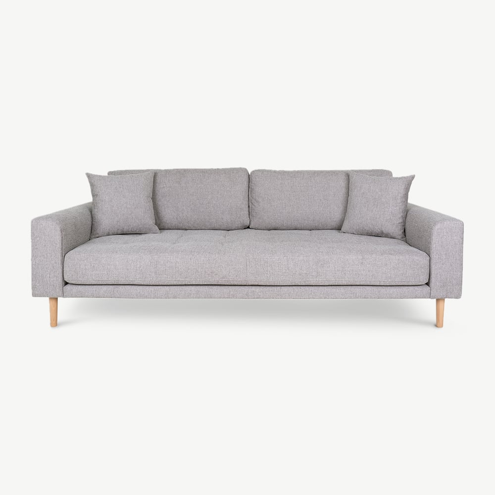 De Lalita 3-zitsbank combineert moderne verfijning met dagelijks comfort. Bekleed met zachte lichtgrijze stof en een doorgestikte zitting, biedt deze ruime bank een stijlvolle en uitnodigende zitervaring. Met een stevige houten constructie, natuurlijke houten poten en twee bijpassende kussens is het de perfecte blikvanger voor een ontspannen en elegant interieur.