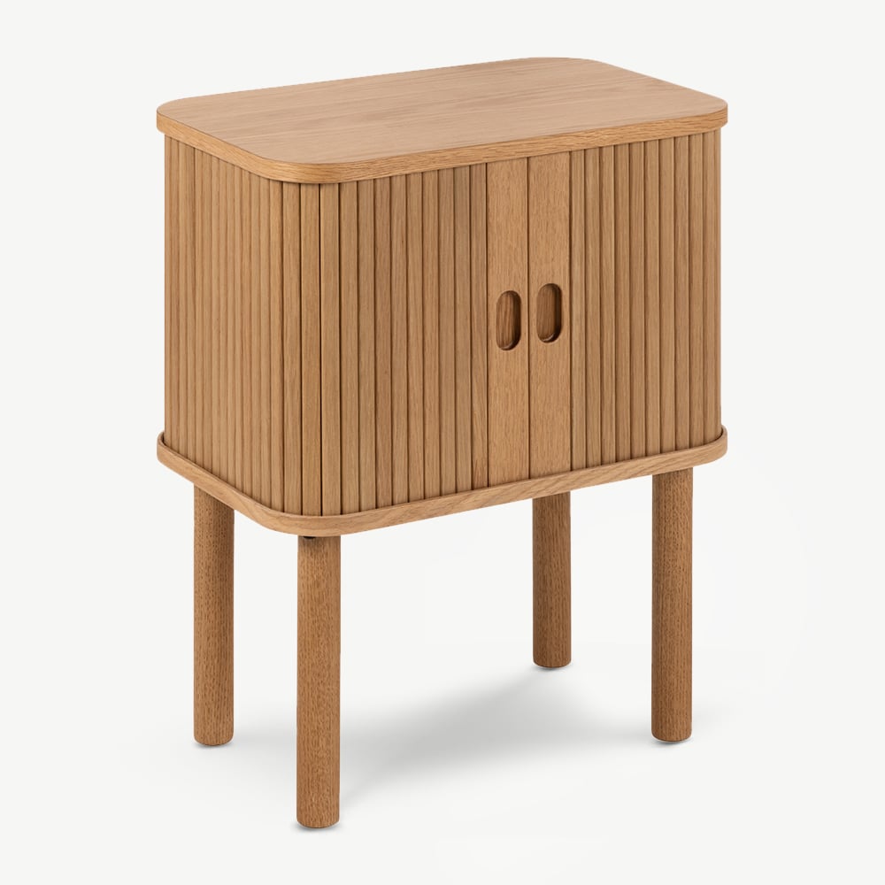 Met een decoratief lamellenfront en schuifdeuren combineert dit nachtkastje stijl en functionaliteit. Het tambour-ontwerp zorgt voor een naadloze toegang tot de opbergruimte en voegt een moderne, Scandinavisch geïnspireerde touch toe aan het uiterlijk.