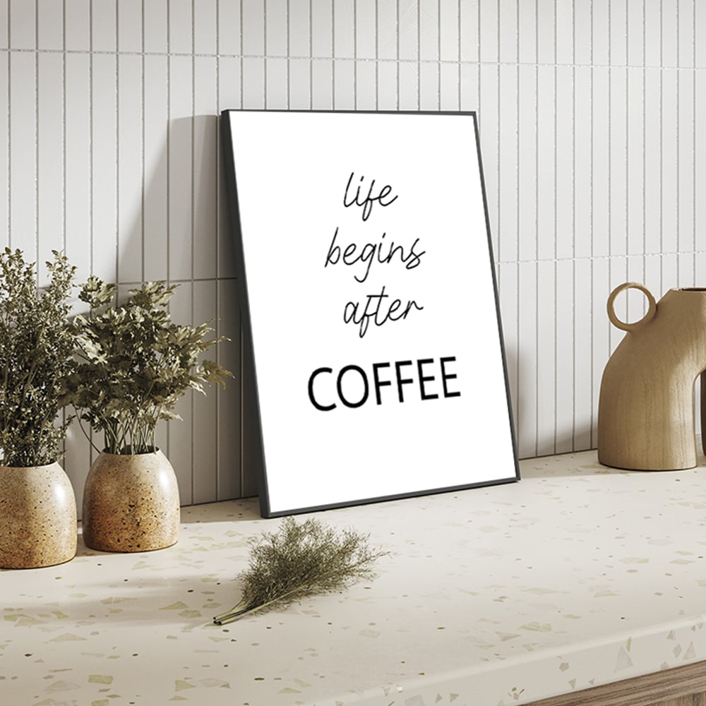 The Life Begins After Coffee poster is een prachtige toevoeging aan elke ruimte. Dit kunstwerk komt tot leven in een stijlvolle print in een dunne zwarte lijst van beukenhout, waardoor het een verfijnde uitstraling krijgt.