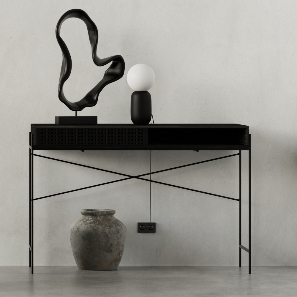 Het zwarte tafelblad met houtnerf voegt een luxe textuur toe, terwijl het gepoedercoate metalen onderstel zorgt voor een strak en stevig contrast. De schuifdeur van metalen gaas geeft een industrieel tintje – perfect te combineren met zwarte accessoires, metalen lampen of lichte muren. Staat super bij zwarte planken of slanke organizers.