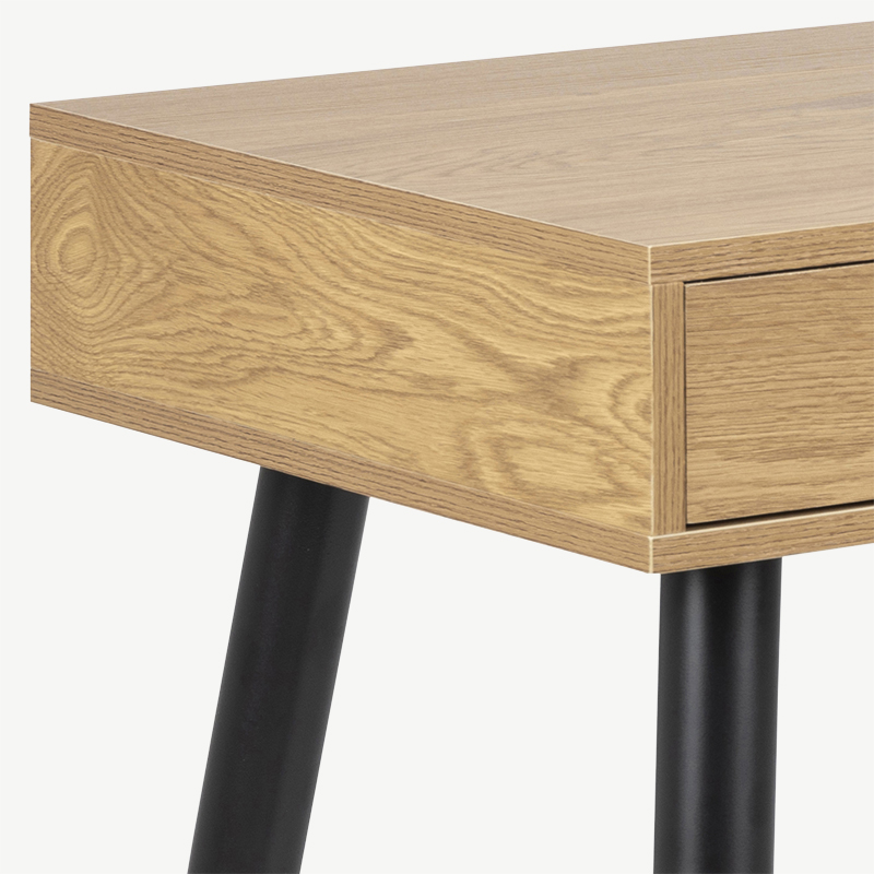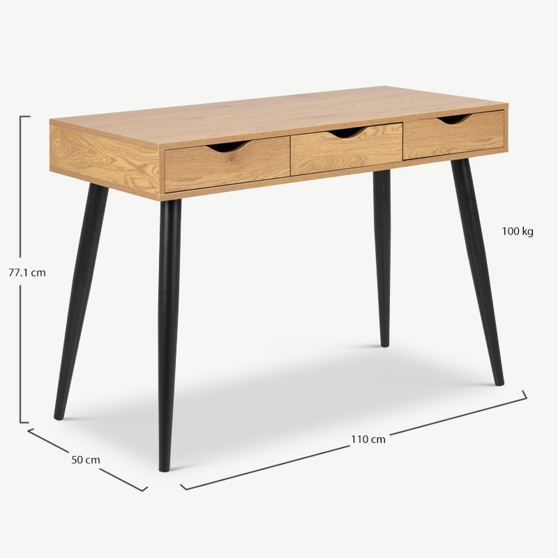 Een natuurlijk houten bureau met metalen poten zoals Mana komt zeker tot zijn recht in je kantoor. Dit bureau geeft je huis een minimalistische en strakke uitstraling met zijn heldere lijnen en taps toelopende poten. De tafel biedt ruimte genoeg voor een laptop, boeken en persoonlijke spullen en beschikt over drie handige opberglades. Het bureau is met zijn zorgvuldig gekozen materialen heel eenvoudig in onderhoud.