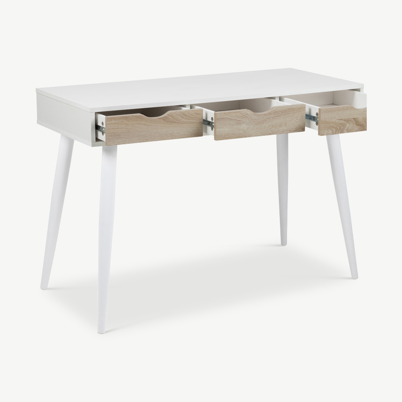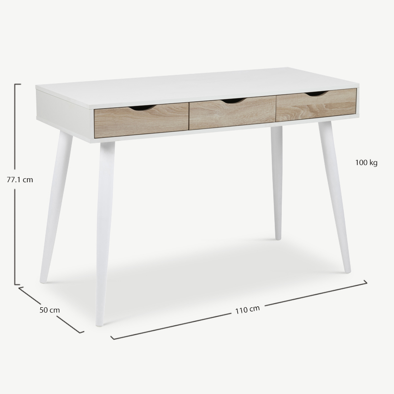 De tafel biedt ruimte genoeg voor een laptop, boeken en persoonlijke spullen, waardoor hij ideaal is voor zowel werk als studie. Daarnaast beschikt hij over drie handige opberglades die voldoende ruimte bieden voor je kantoorbenodigdheden, zodat je werkplek netjes en georganiseerd blijft.