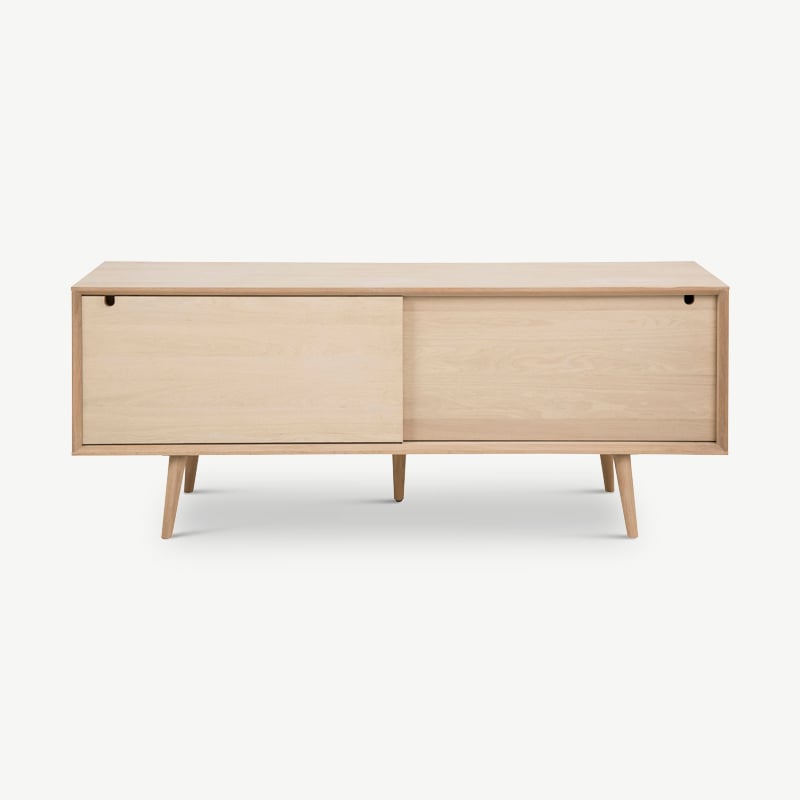 Het Melody Dressoir van licht eikenhout combineert een minimalistisch ontwerp met een functionele indeling. De wit gepigmenteerde eikenfineer afwerking benadrukt de natuurlijke houtnerf. Het elegante fineerlichaam en de stevige eiken poten maken het een verfijnde toevoeging aan Scandinavische en moderne interieurs.