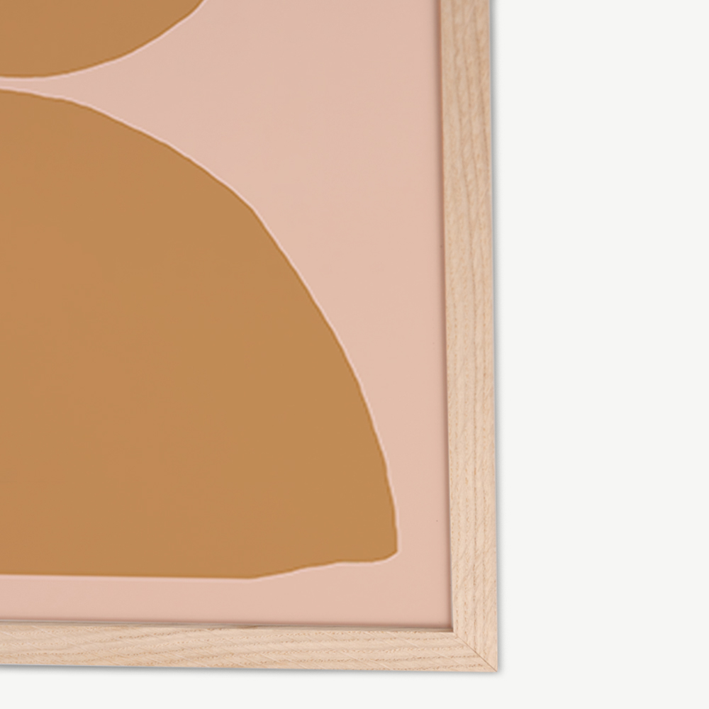 De Organic Shapes poster wordt geleverd in een natuurlijke lijst, bekend om zijn duurzaamheid en natuurlijke schoonheid. Het houten frame omlijst de abstracte poster op een manier die diepte en dimensie toevoegt, waardoor het een echt middelpunt in je interieur wordt.