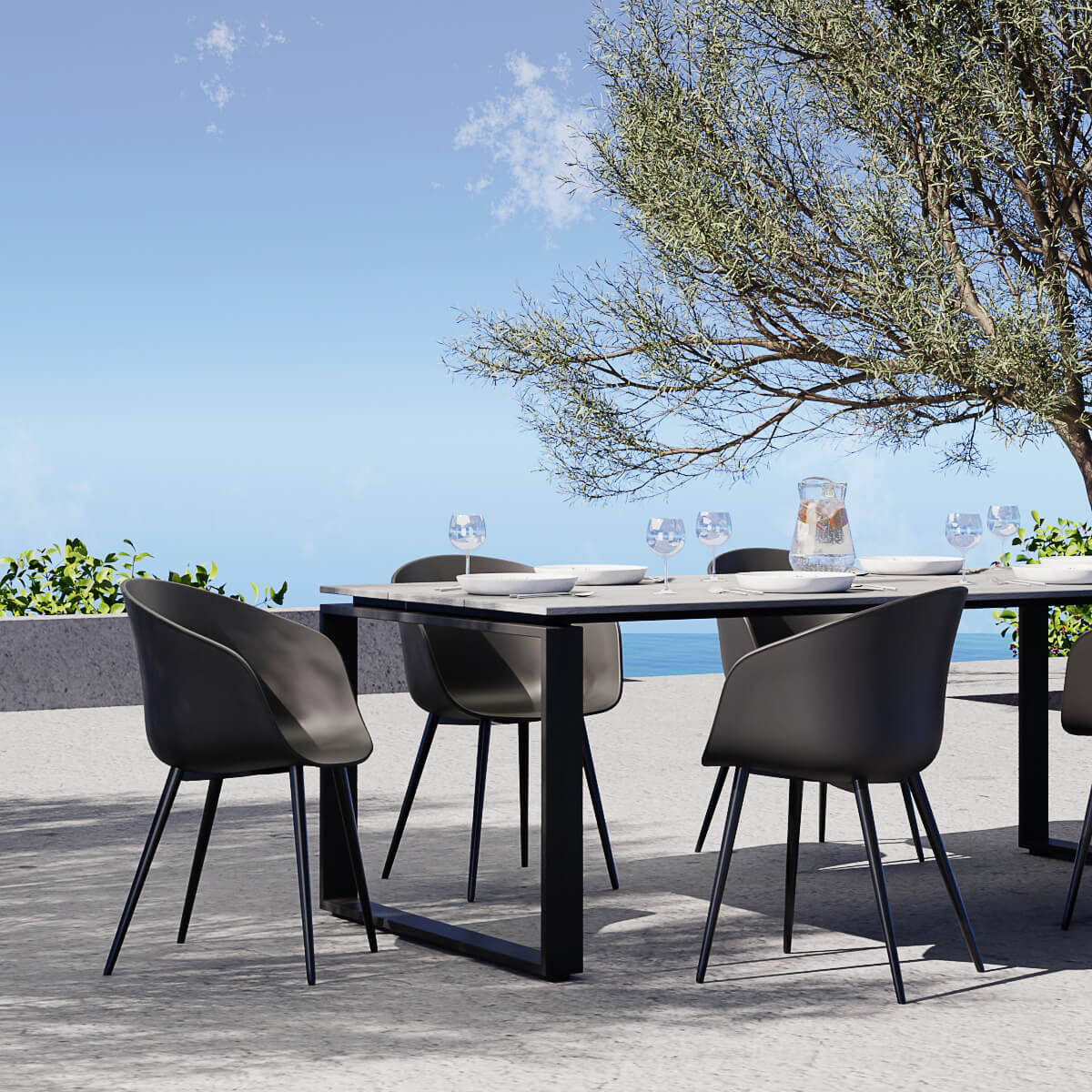 De PP zwarte Ronda Tuinstoel met zwarte metalen poten geeft de stoel een stevige en robuuste constructie met een speelse touch.