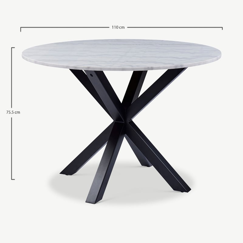 Met een diameter van 110 cm past de Talon tafel makkelijk in keukens of kleinere eetruimtes en biedt toch genoeg plek voor 4 personen. De sterke metalen basis zorgt voor stabiliteit, en het gekruiste onderstel voegt extra stevigheid én stijl toe.