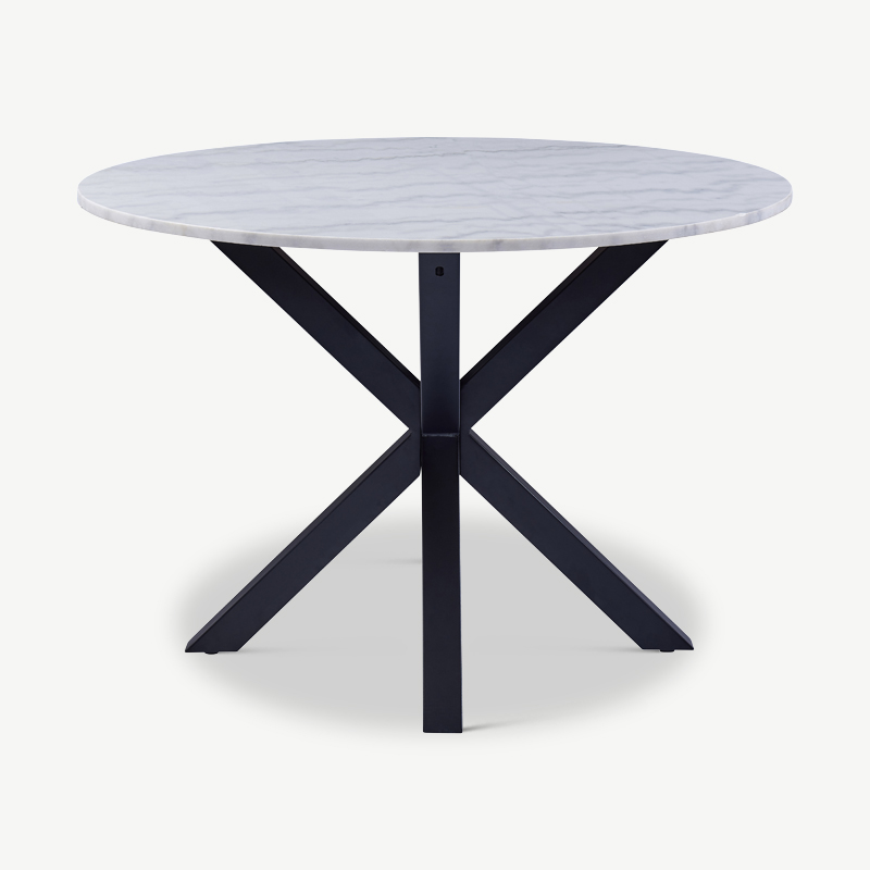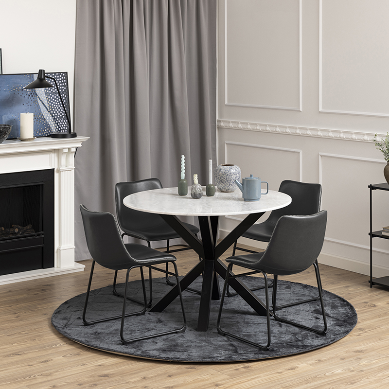 De Talon ronde eettafel is een echte eyecatcher die stijl en stevigheid combineert. Met een wit marmeren tafelblad en zwarte, grof gepoedercoate metalen kruispoten biedt deze tafel van Ø110 cm comfortabel plaats aan 4 personen. Ideaal voor kleinere eetruimtes of gezellige diners waar looks én functie belangrijk zijn.