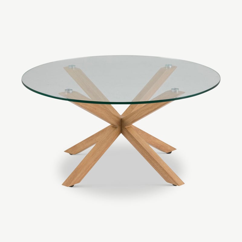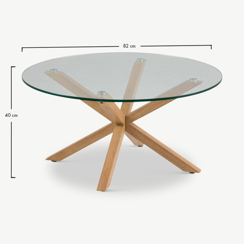 Het glazen blad is stevig en makkelijk schoon te maken – ideaal voor koffiemomenten, borrels of het stylen van decoratie. De gekruiste poten zorgen voor een stabiele basis, terwijl de ronde vorm beweging en een gezellige flow in de kamer bevordert.