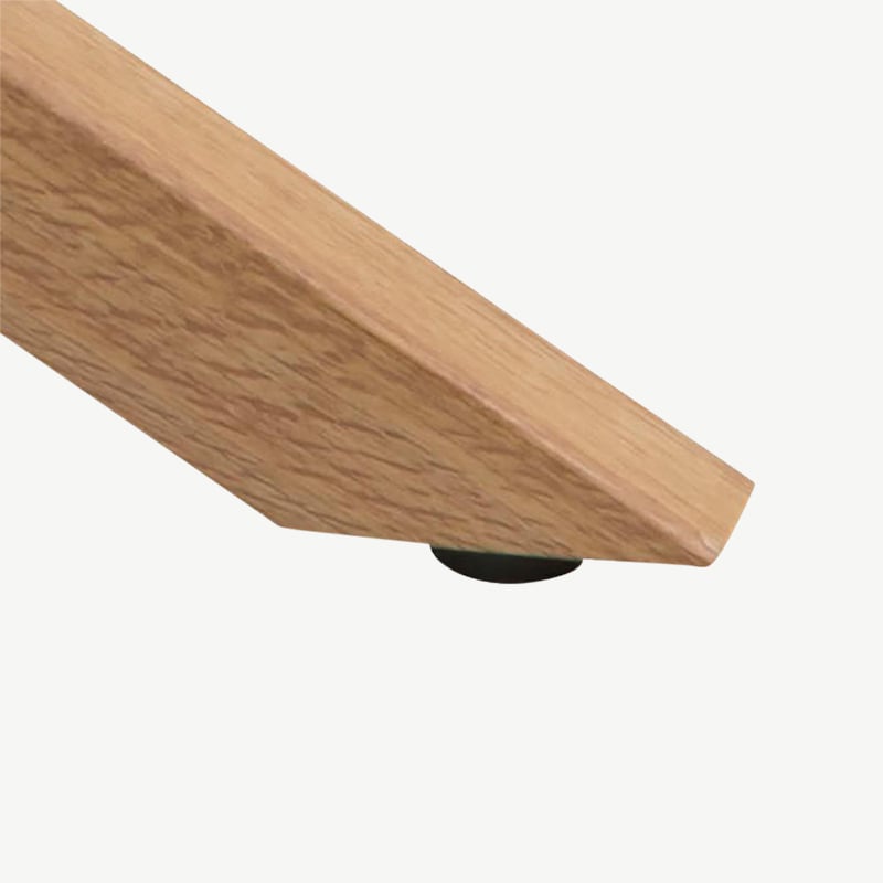 De combinatie van glas en metalen poten met houtlook zorgt voor een frisse en tijdloze uitstraling. Het sculpturale onderstel voegt een subtiel architecturaal element toe, zonder te veel op te vallen.
