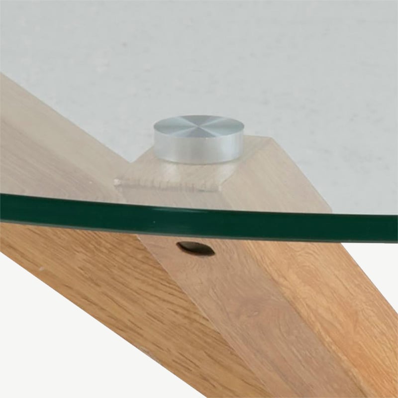 Het transparante glazen blad vormt een mooi geheel met het onderstel in eikenlook en zorgt voor een lichte, luchtige uitstraling. Past perfect in Scandinavische, moderne of tijdloze interieurs. Dankzij het open design is de tafel ook ideaal om kleinere ruimtes optisch groter te maken of juist balans te brengen in een krachtig interieur.
