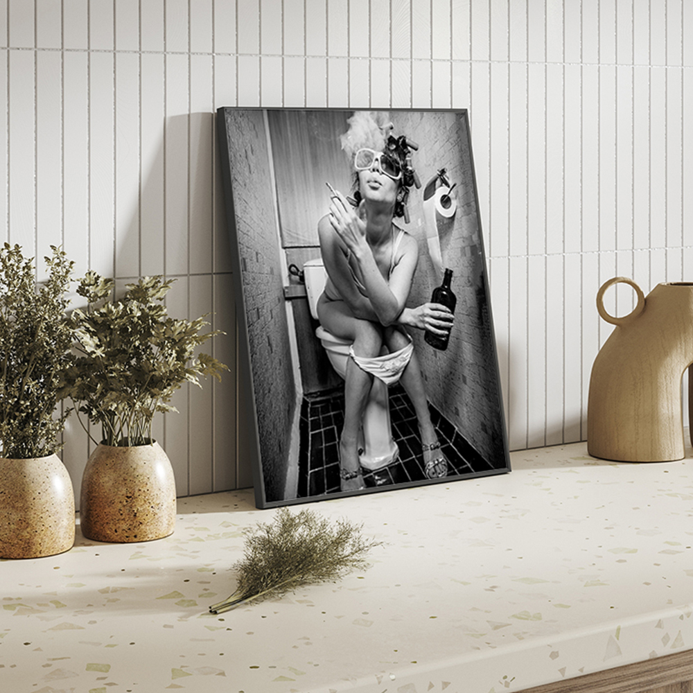 De Toilet Girl poster wordt geleverd in een zwarte lijst, bekend om zijn duurzaamheid en natuurlijke schoonheid. Het houten frame omlijst de poster op een manier die diepte en dimensie toevoegt, waardoor het een echt middelpunt van je interieur wordt.