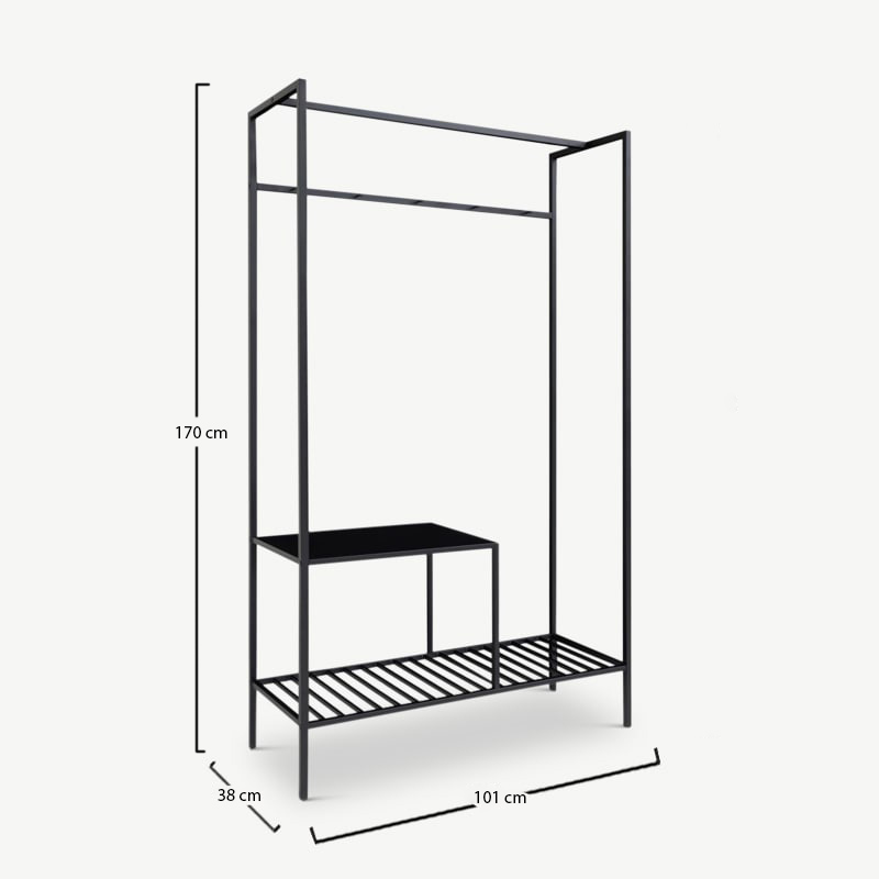 Met een zwart houten plank, een onderrek van gaas voor schoenen en een kledingstang, biedt deze kast genoeg opbergruimte. Het open ontwerp zorgt voor makkelijke toegang en een nette, ruimtelijke uitstraling.
