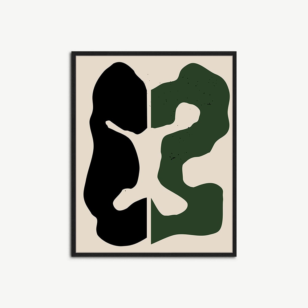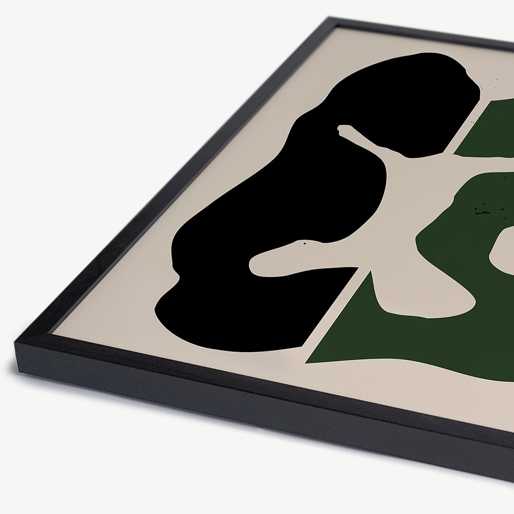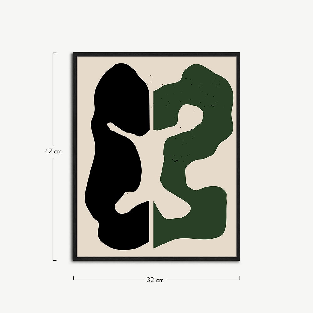 De Black & Green poster wordt geleverd in een zwarte lijst, bekend om zijn duurzaamheid en natuurlijke schoonheid. Het houten frame omlijst de abstracte poster op een manier die diepte en dimensie toevoegt, waardoor het een echt middelpunt in je interieur wordt.